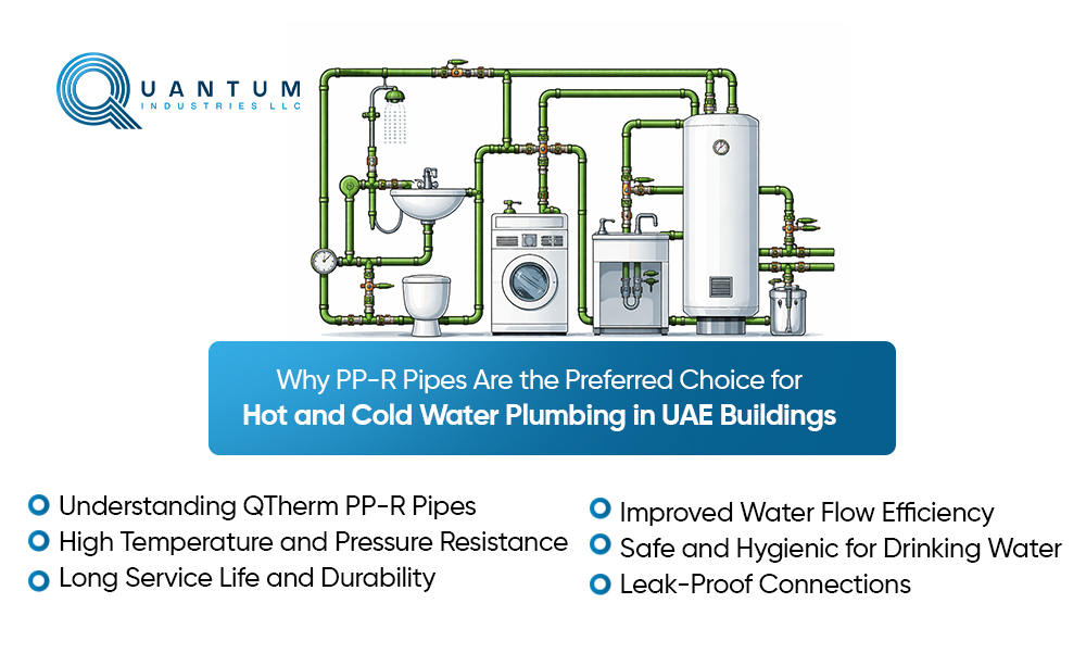 QTherm PP-R pipes have become the preferred choice for hot and cold water plumbing systems in UAE buildings due to their durability, temperature resistance, and hygienic properties. Their ability to resist corrosion, maintain efficient water flow, and provide leak-proof connections makes them highly suitable for modern construction projects.